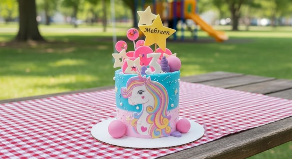 Step into a world of magic with the Magical Unicorn Cake. With a rainbow mane, twinkling stars, lollipops, and a personalized name banner this cake is colorful, whimsical, and fun