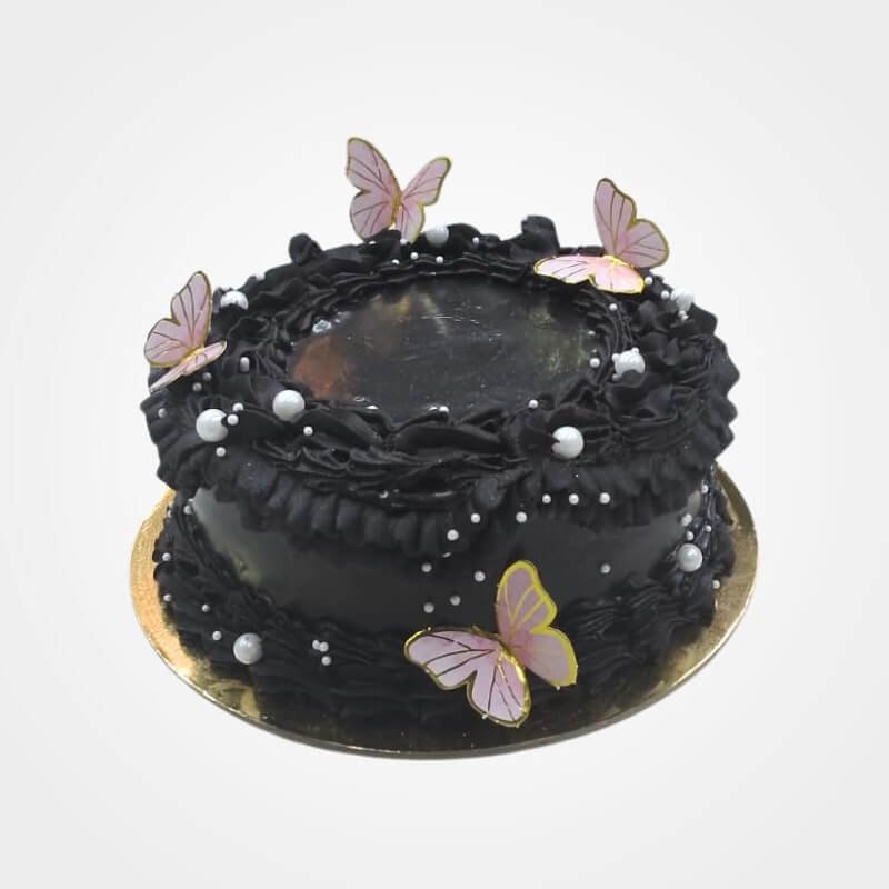 The Black Butterfly Cake is a strikingly elegant dessert that captivates at first glance. Its rich black surface is piped with intricate ruffles and scattered with delicate white pearls, all crafted with smooth fresh cream. Soft pink butterflies flutter across the design, adding a touch of charm to this refined butterfly cake.
