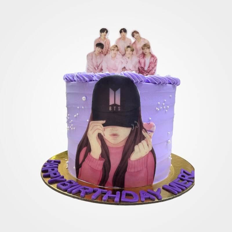 This BTS Cake is a dream come true for any K-Pop fan. The stylish purple cake features smooth fresh cream frosting and is decorated with an illustration of a devoted fan, along with a BTS birthday cake topper showcasing the entire band. It’s a vibrant and exciting BTS cake design that brings energy to any celebration.