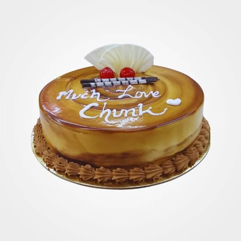 This classic Butterscotch Cake is a sweet and timeless delight. Featuring a glossy caramel glaze with an elegant swirl on top, it’s finished with a piped chocolate border, a white chocolate fan, two cherries, and a personalized message—all crafted with smooth fresh cream for a rich, indulgent taste.