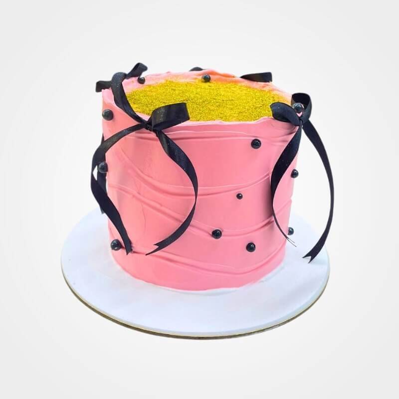 The Chic Ribbon Glam Cake is a stunningly modern theme cake, ideal for stylish and elegant celebrations. This eye-catching pink cake features a vibrant fresh cream finish with a trendy wavy texture, beautifully adorned with bold black ribbons and delicate edible pearls. A lavish layer of shimmering gold glitter on top adds that extra touch of glamour, making it a true showstopper.