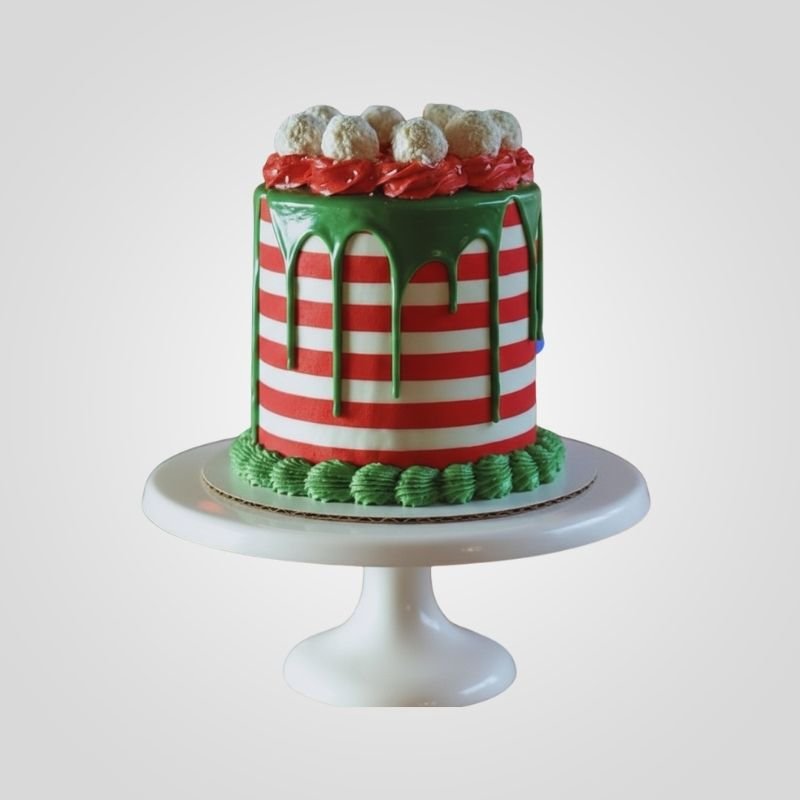 The Christmas Candy Cane Cake is a fun and colorful treat for your holiday celebration. This playful cake features bright red and white stripes on the side that look just like a classic candy cane. It is topped with a cool green drip, red swirls, and delicious white coconut truffles to create a very sweet Christmas cake.
