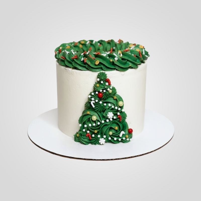 The Christmas tree cake is a lovely and classic treat for the holiday season. This smooth white cake has a thick green border on top and features a beautifully piped Christmas tree on the side. The tree is decorated with colorful sprinkles and small candy shapes to make a delightful Christmas cake.
