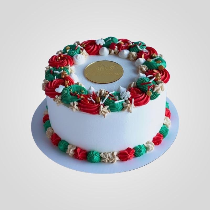 The Christmas Wreath Cake is a classic and colorful choice for your holiday celebration. This smooth white cake features a beautiful ring of red, green, and cream swirls on top that looks just like a festive wreath. It is decorated with fun sprinkles and a shiny gold sign in the center to create a perfect Christmas cake.