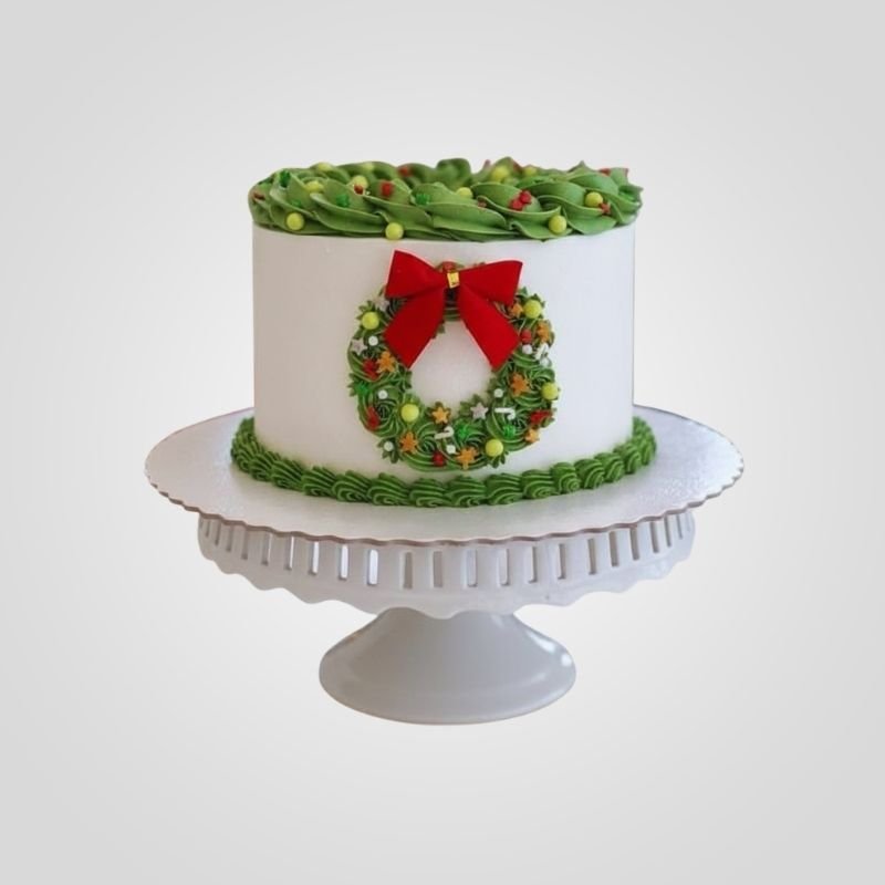 The Festive Christmas cake is a delightful way to spread holiday cheer. This clean white cake is framed with bright green piped borders and features a cute wreath design on the side. It is decorated with a big red bow and colorful sprinkles to make it a perfect Christmas cake.