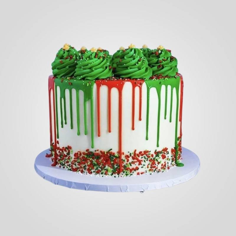 The Jolly Drip Cake is a bright and cheerful choice for your holiday season. This smooth white cake features alternating red and green chocolate drips running down the sides. The base is covered in colorful festive sprinkles and the top is crowned with green swirls that look like mini trees to create a fun Christmas cake.