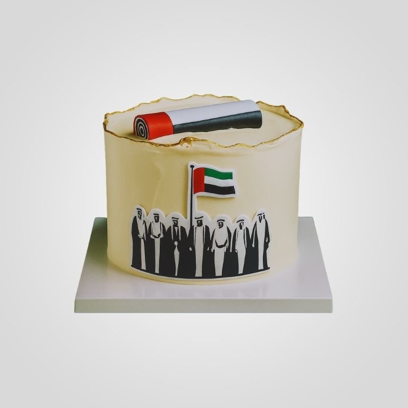 Celebrate the spirit of the union with our National Theme Cake 2. This dignified cake features a smooth cream finish accented by artistic gold-painted rough edges that add a touch of regality. The design is highlighted by a rolled fondant scroll in the UAE flag colors resting on top, while the side proudly displays the iconic silhouette of the nation’s rulers standing together beneath the waving flag.