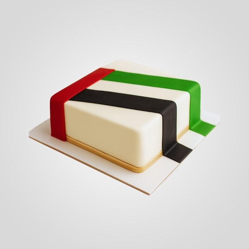Celebrate the UAE National Day with our modern National Theme Cake 3. This stylish theme cake is a square shape covered in smooth white icing. It is decorated with wide ribbons of red, green, and black fondant that look like the UAE flag draped over the top. The bottom has a shiny gold border to make it look extra special and elegant.