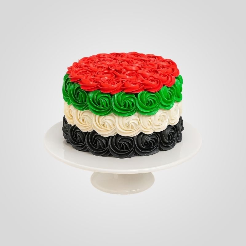 Celebrate with our vibrant National Theme Cake 7. This exquisite round cake is completely covered in luscious buttercream rosettes that have been meticulously piped to represent the proud UAE flag colors. The top features a bold layer of red swirls while the sides cascade in stunning bands of green, white, and black to create a textured and floral masterpiece that looks as delightful as it tastes.