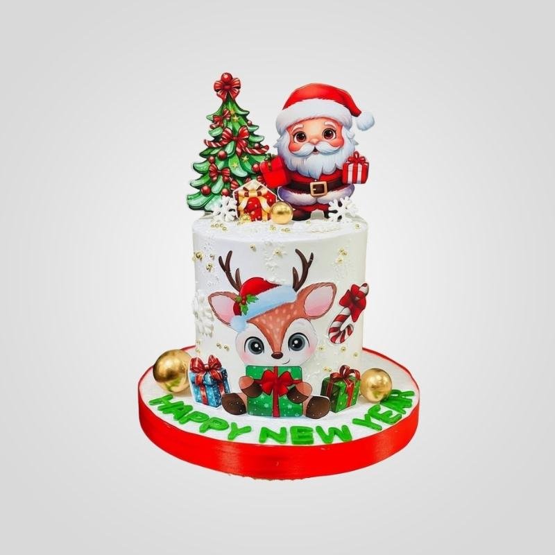 The New Year Christmas cake is a perfect way to celebrate two special holidays at once. This adorable white cake features a cute reindeer holding a green gift on the front and is decorated with candy canes and shiny gold balls. It is topped with a smiling Santa and a Christmas tree while the board carries a green Happy New Year message to welcome the fresh year.