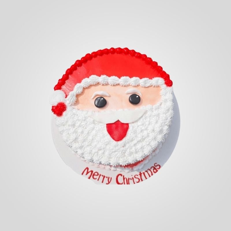 The Santa Claus face themed cake is a cheerful and jolly choice for your holiday celebration. This round cake is decorated to look just like a smiling Santa with a bright red hat and a fluffy white beard made of piped cream. It features cute black eyes and a happy smile to create a delightful Christmas cake.