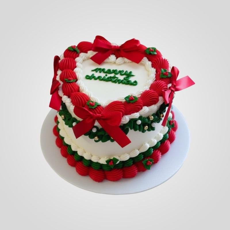 The Vintage style Christmas heart cake is a charming and lovely choice that brings a classic feel to your holiday. This heart shaped white cake is beautifully decorated with deep red and green piping that looks like old fashioned ruffles. It features cute red ribbon bows on the sides and a green script greeting on top to create a perfect Christmas cake.